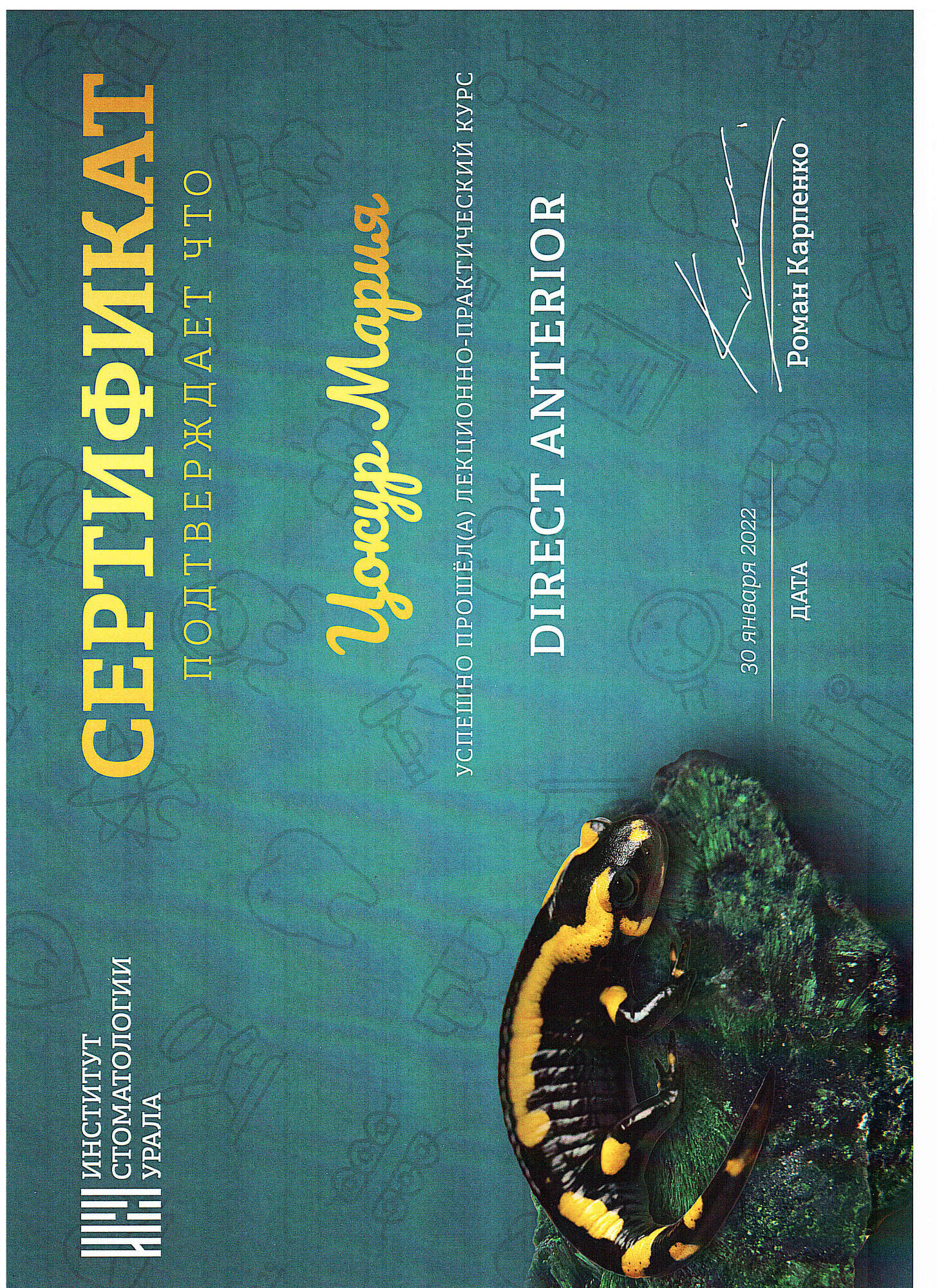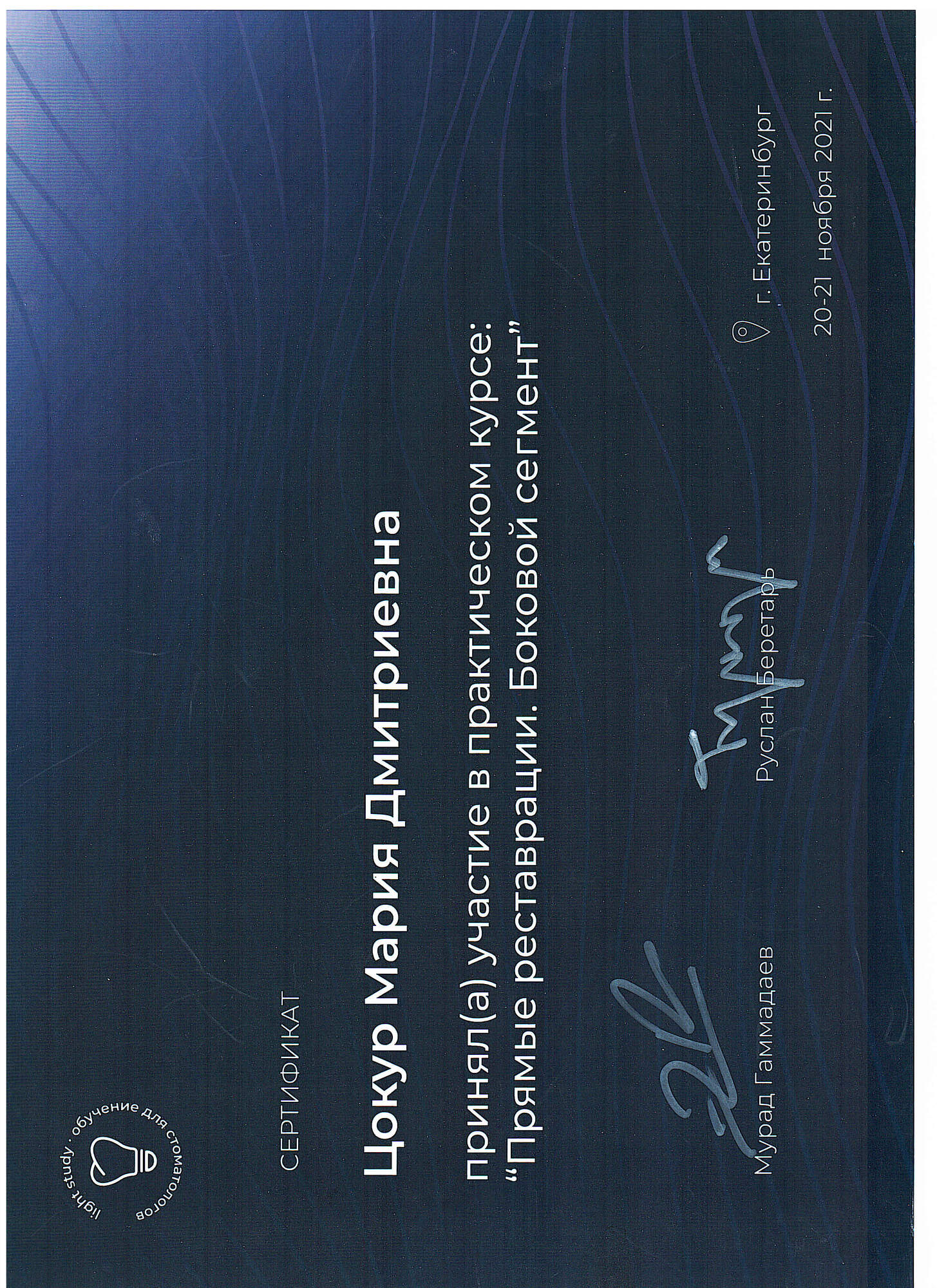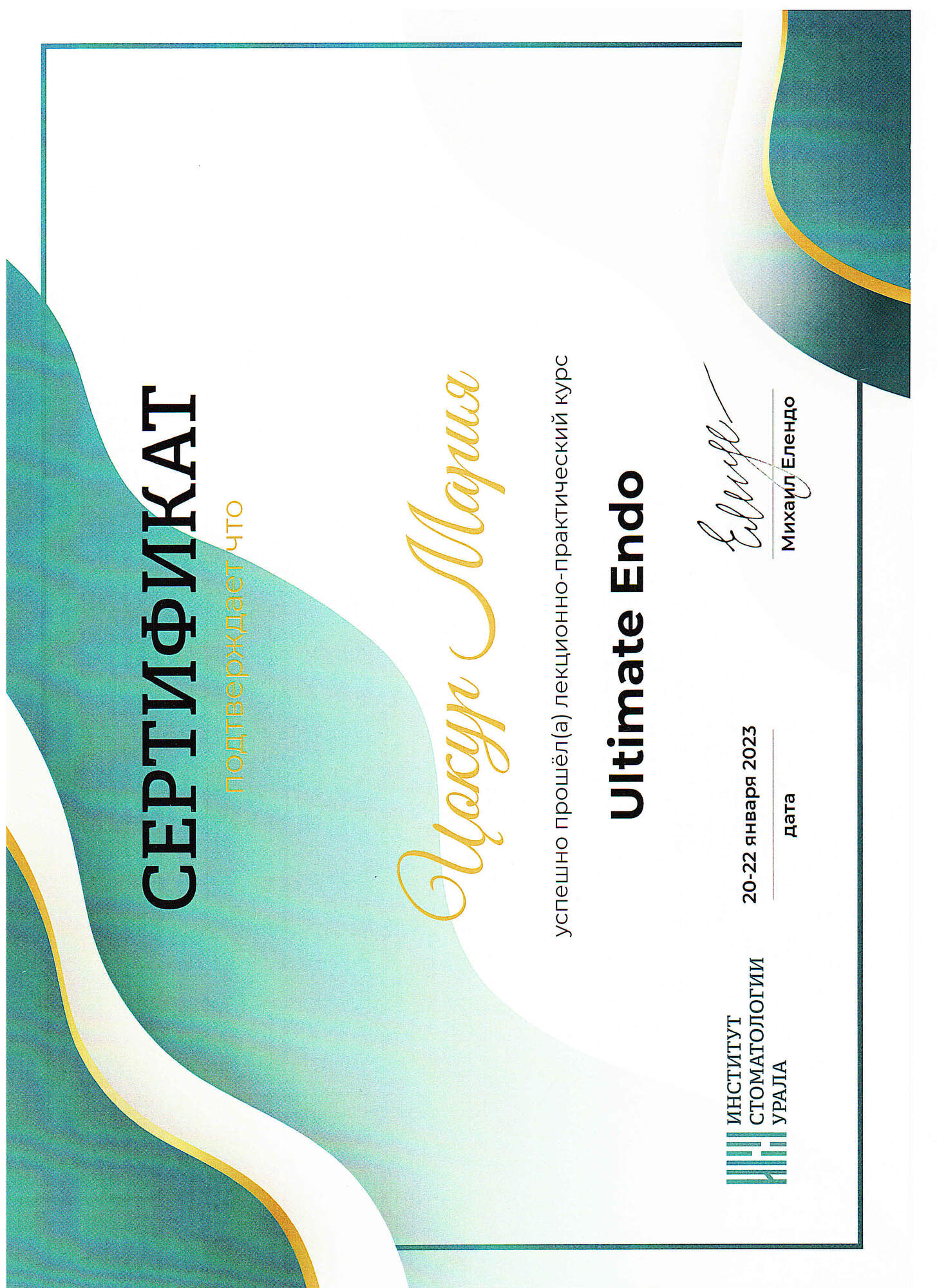 - 2021 г. – «Уральский Государственный Медицинский Университет», г. Екатеринбург. Специальность «Стоматология».