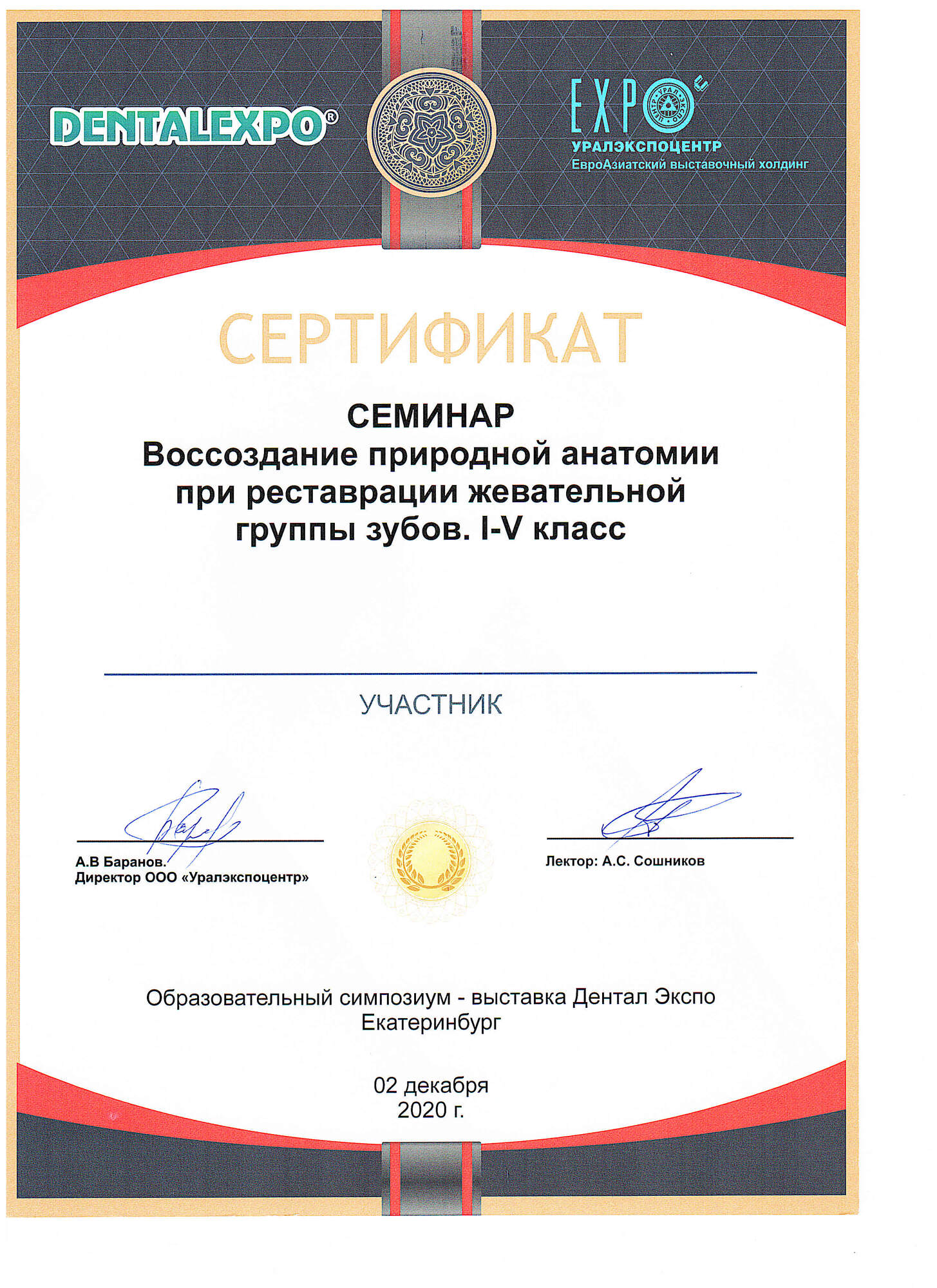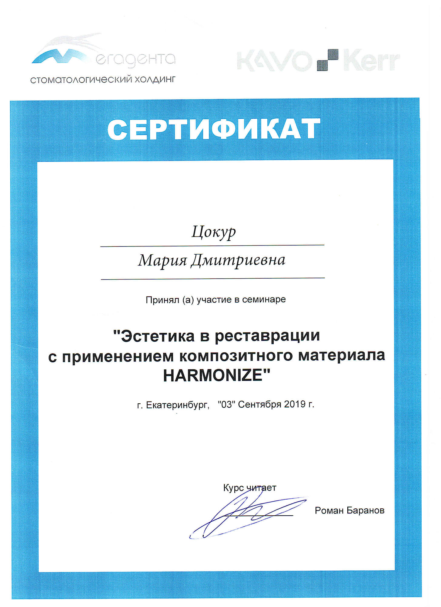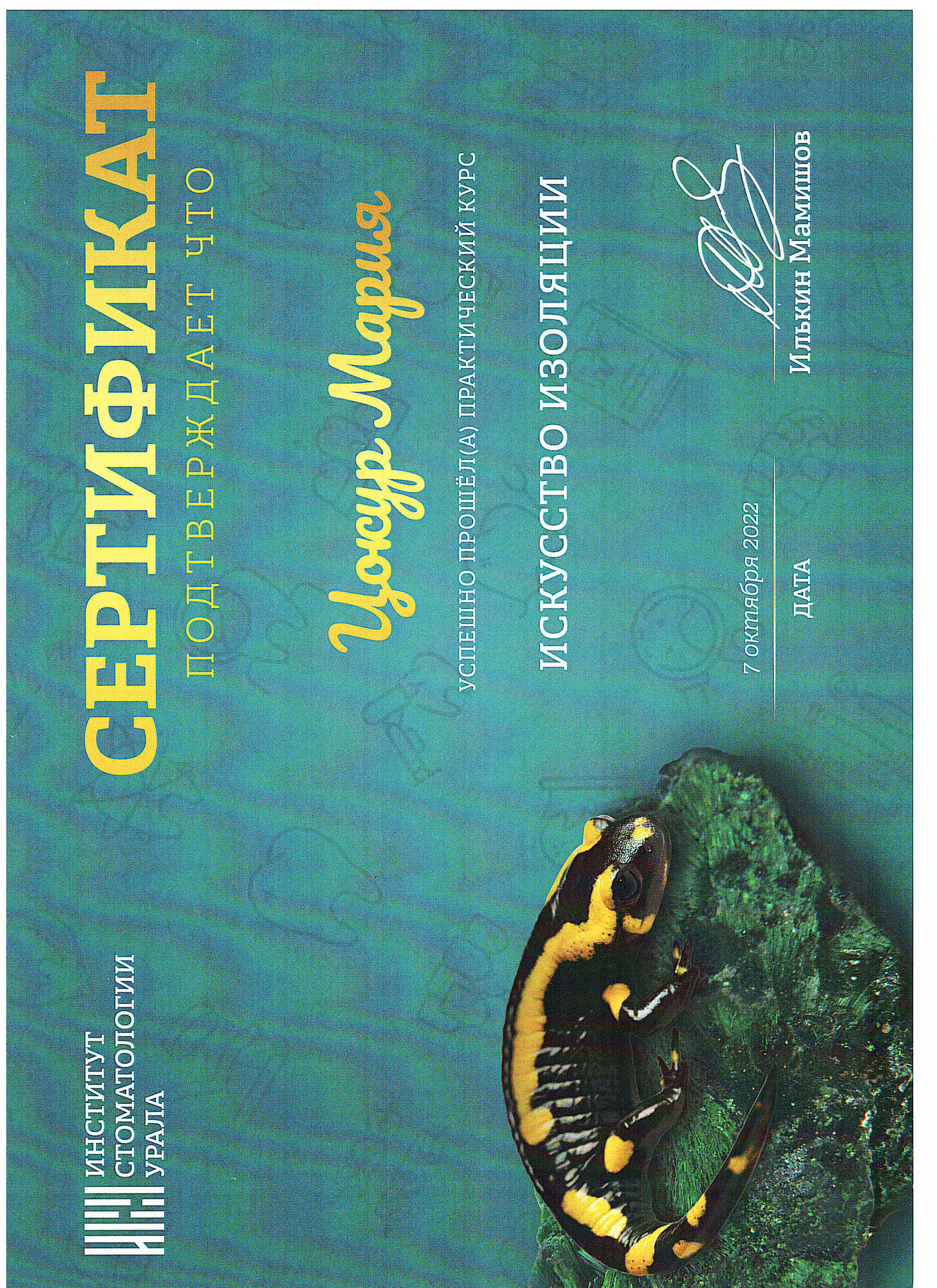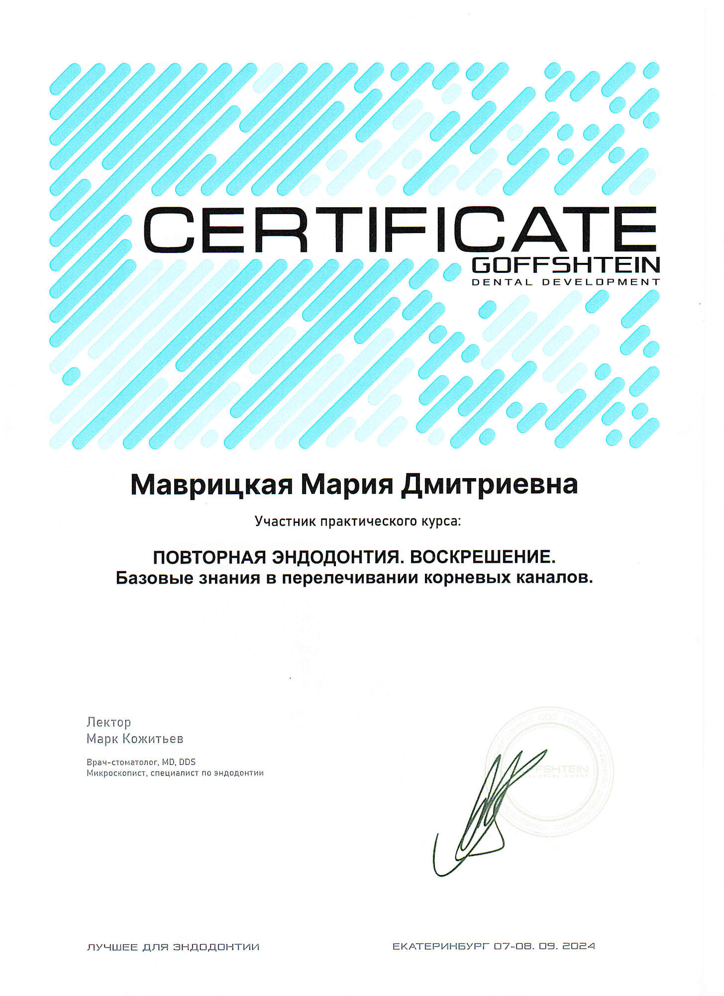 - 2021 г. – «Уральский Государственный Медицинский Университет», г. Екатеринбург. Специальность «Стоматология».