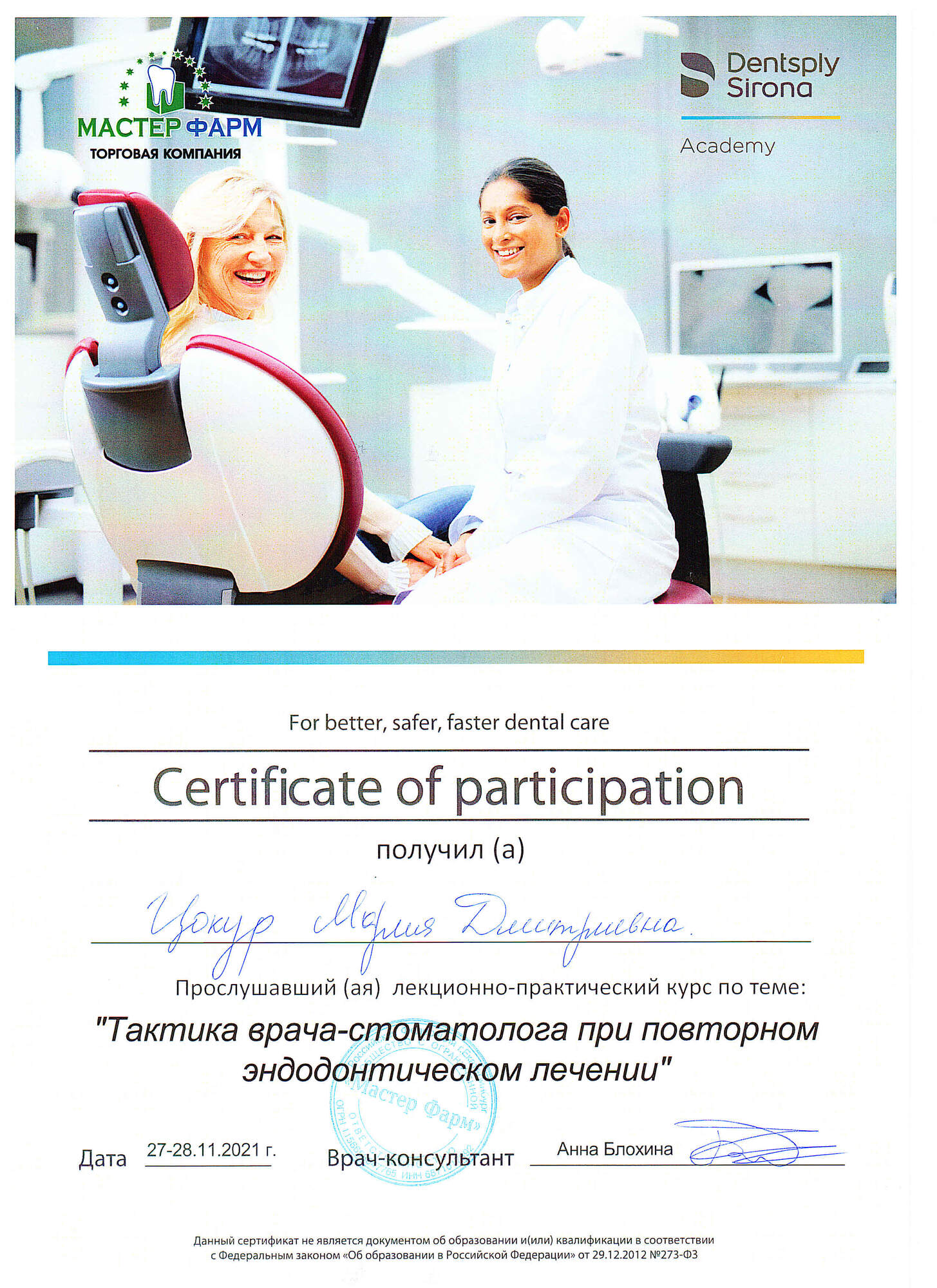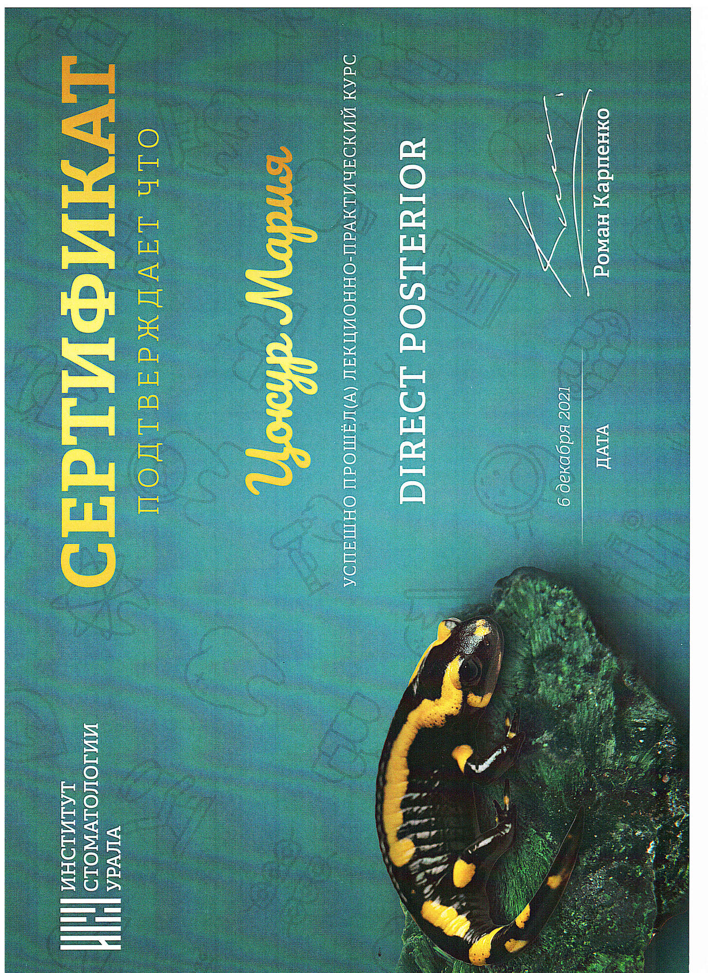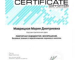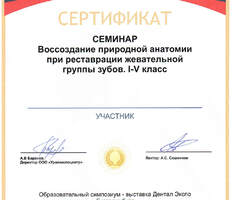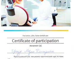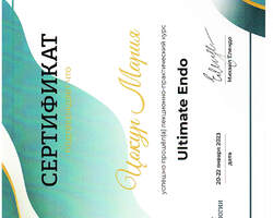 - 2021 г. - 2023 г. - Клиническая ординатура на кафедре терапевтической стоматологии "УГМУ", первичная аккредитация по специальности "Стоматология терапевтическая".